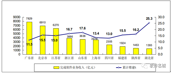 圖7 2019年1-8月軟件業(yè)務(wù)收入前十位省市增長(zhǎng)情況