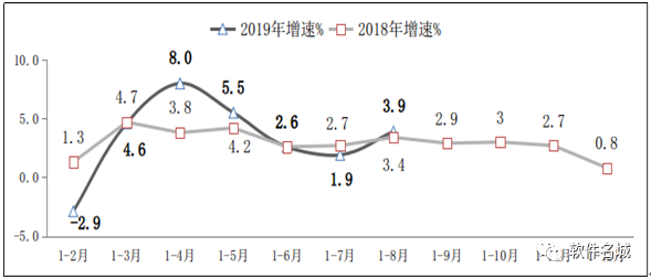 圖2 2018年-2019年1-8月軟件業(yè)利潤(rùn)總額增長(zhǎng)情況
