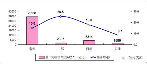 東、西部地區(qū)軟件業(yè)收入保持較快增長(zhǎng),中部地區(qū)增勢(shì)突出。1-8月,東部地區(qū)完成軟件業(yè)務(wù)收入35658億元,同比增長(zhǎng)15.0%,增速與去年同期持平。中部地區(qū)完成軟件業(yè)務(wù)收入2307億元,增長(zhǎng)25.5%,增速同比提高8.5個(gè)百分點(diǎn),高出全國(guó)平均水平10.6個(gè)百分點(diǎn)。西部地區(qū)完成軟件業(yè)務(wù)收入5314億元,增長(zhǎng)18.0%,增速同比提高3.6個(gè)百分點(diǎn)。東北地區(qū)完成軟件業(yè)務(wù)收入1586億元,同比增長(zhǎng)8.7%,增速同比回落0.3個(gè)百分點(diǎn)。四個(gè)地區(qū)軟件業(yè)務(wù)收入在全國(guó)總收入中的占比分別為:79.5%、5.1%、11.9%和3.5%。